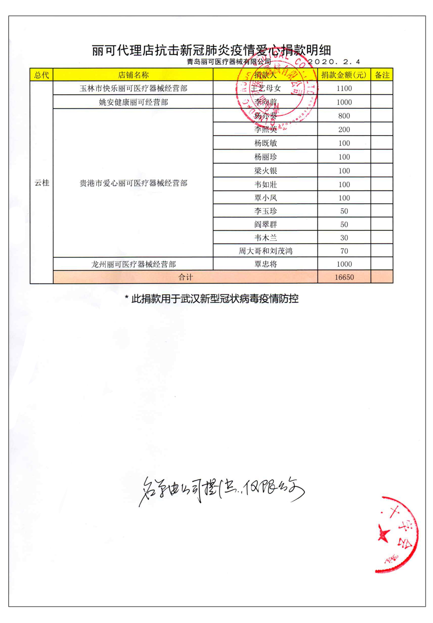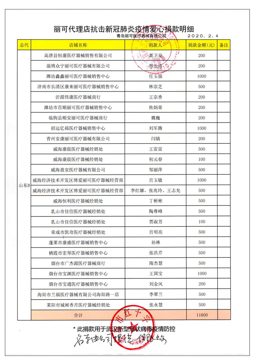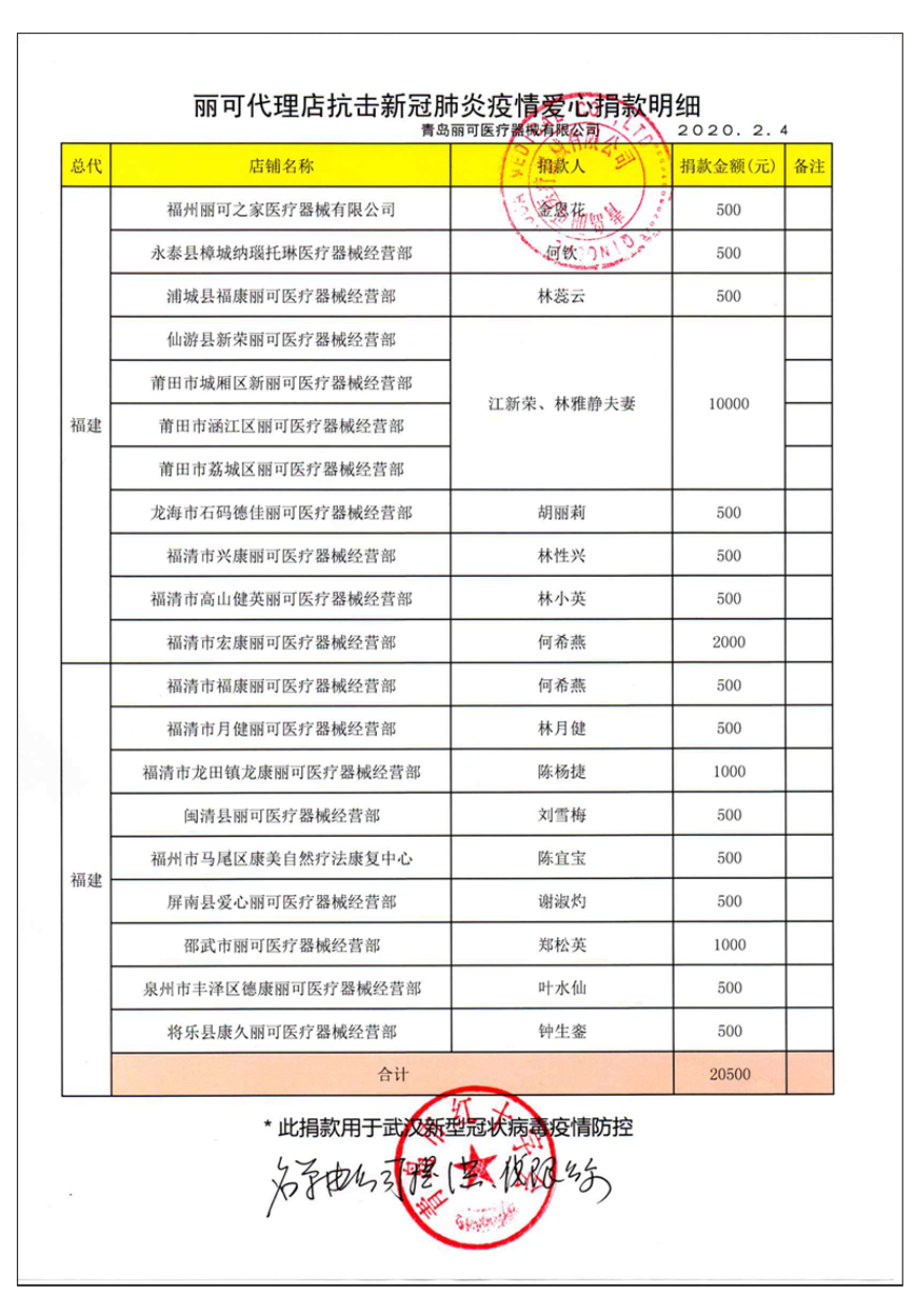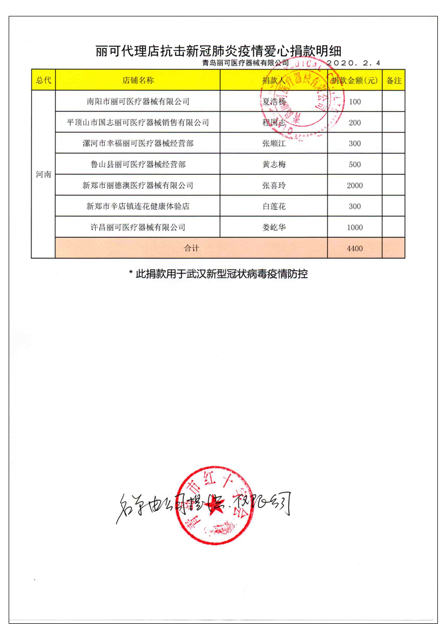 越來(lái)越多的人在麗可的號(hào)召下加入到愛(ài)心捐贈(zèng)的隊(duì)伍中來(lái),匯成一股愛(ài)心與力量的強(qiáng)大洪流。2月4日,青島麗可醫(yī)療器械有限公司攜手全國(guó)經(jīng)銷商以及熱心顧客通過(guò)青島市紅十字會(huì)捐款人民幣72萬(wàn)余元,助力湖北省武漢市的疫情防控工作。