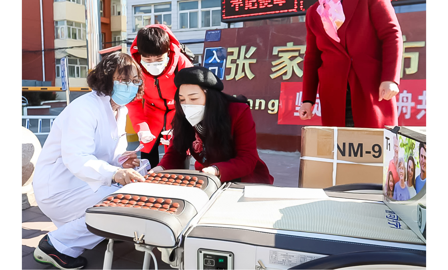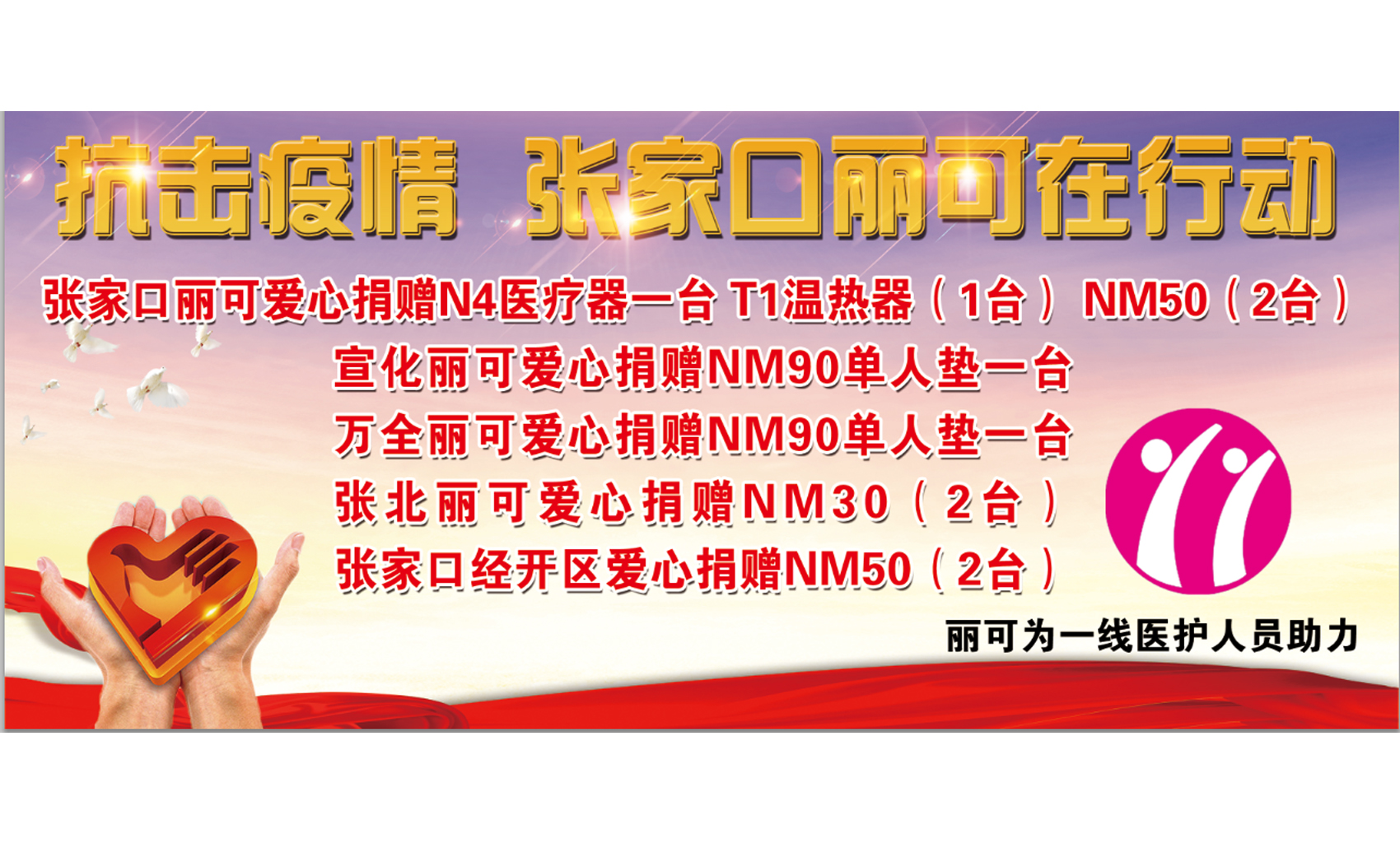 3月4日,一場捐贈儀式在張家口市傳染病醫(yī)院的門前匆匆進(jìn)行。地上擺放的是當(dāng)?shù)佧惪墒聵I(yè)者(張家口愛心麗可、宣化麗可、萬全麗可、張北麗可、張家口經(jīng)開區(qū)愛心麗可)為白衣天使們準(zhǔn)備的禮物----1臺已經(jīng)安裝好的N4自動溫?zé)峤M合醫(yī)療器、1臺T1托爾瑪鈕腹部溫?zé)嵘w、2臺NM90托爾瑪鈕床墊、4臺NM50腹部康電熱墊、2臺NM30托瑪琳治療墊。