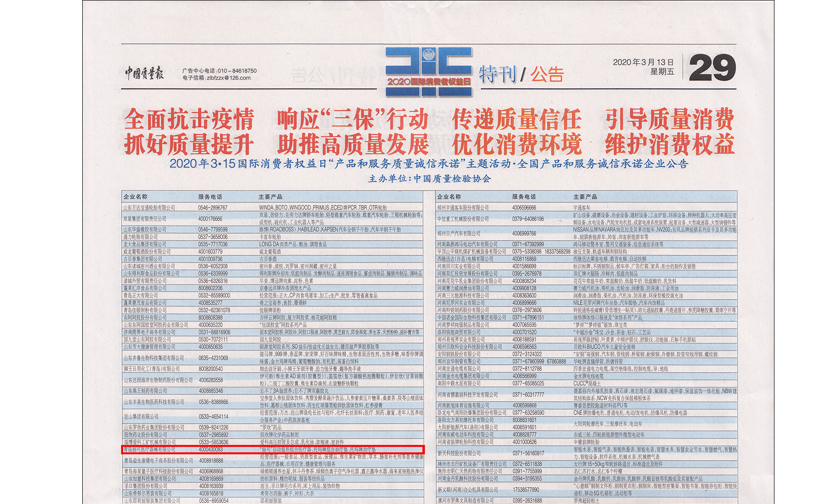 中國質(zhì)量報(bào)、中國消費(fèi)者報(bào)公布了獲獎(jiǎng)企業(yè)名錄。