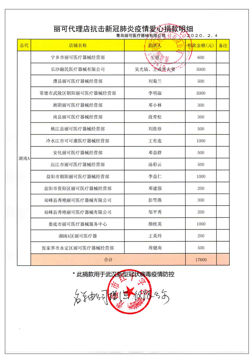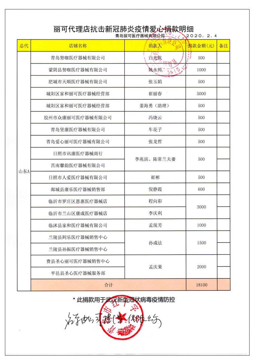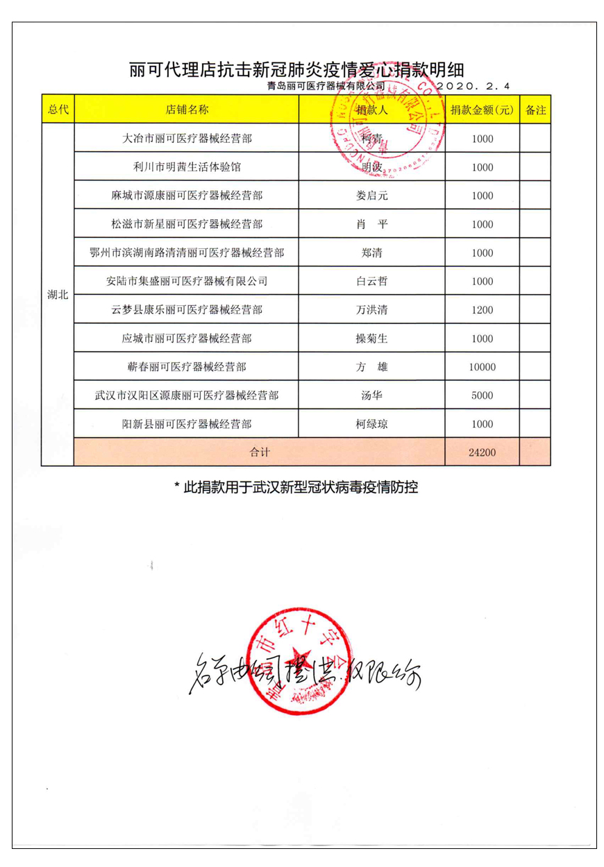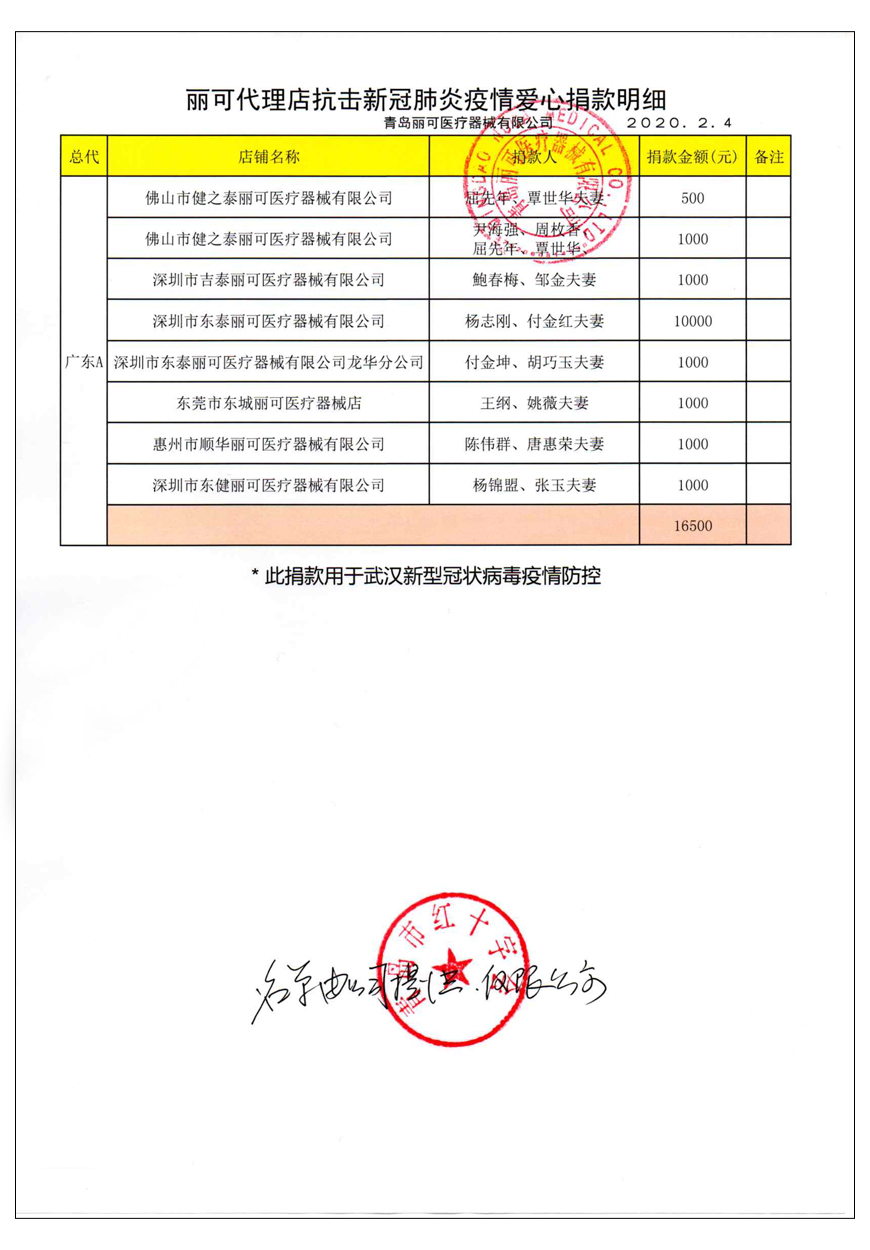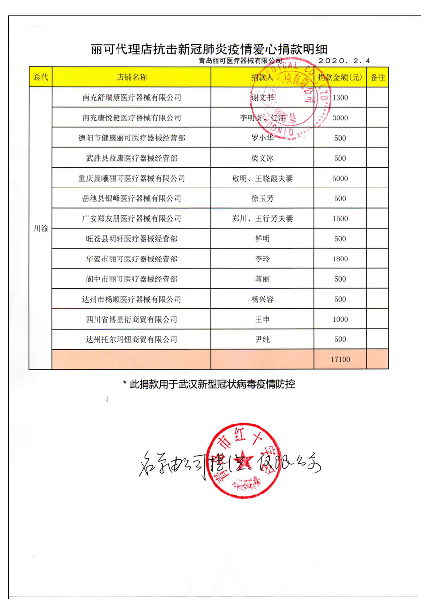 越來(lái)越多的人在麗可的號(hào)召下加入到愛(ài)心捐贈(zèng)的隊(duì)伍中來(lái),匯成一股愛(ài)心與力量的強(qiáng)大洪流。2月4日,青島麗可醫(yī)療器械有限公司攜手全國(guó)經(jīng)銷商以及熱心顧客通過(guò)青島市紅十字會(huì)捐款人民幣72萬(wàn)余元,助力湖北省武漢市的疫情防控工作。