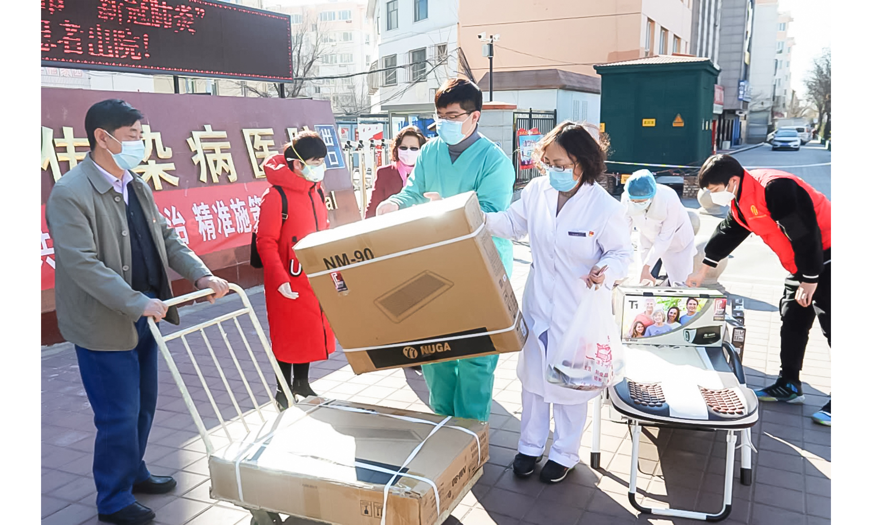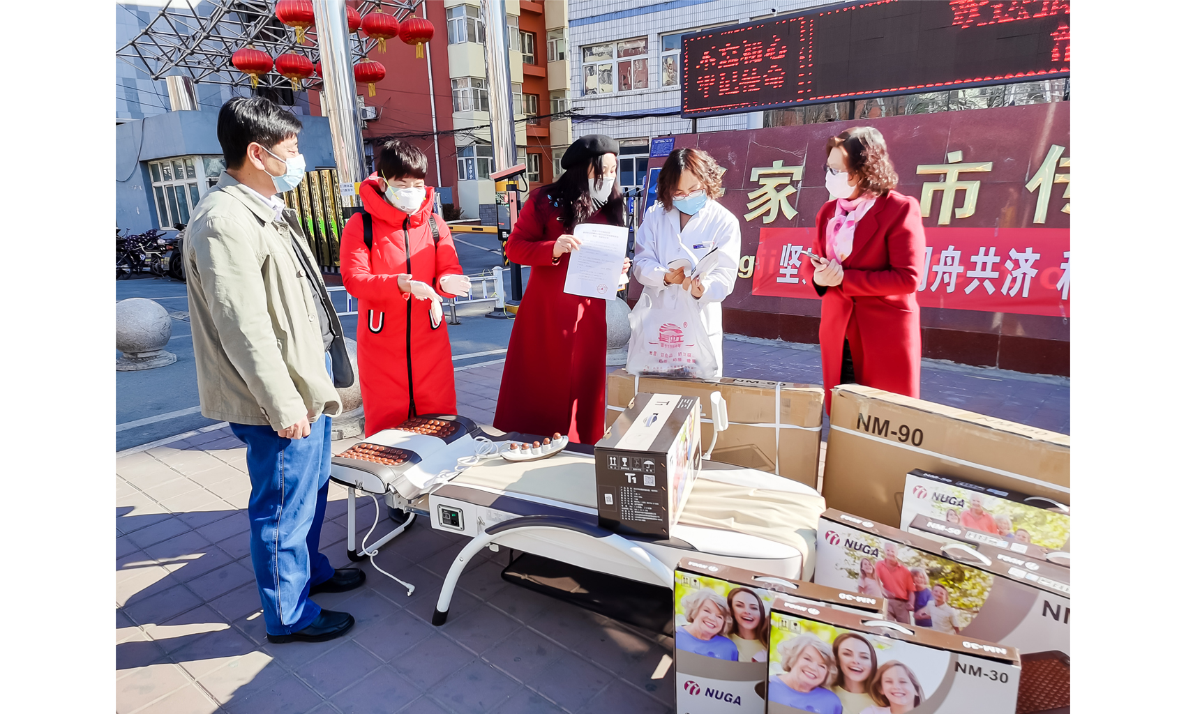 3月4日,一場捐贈儀式在張家口市傳染病醫(yī)院的門前匆匆進(jìn)行。地上擺放的是當(dāng)?shù)佧惪墒聵I(yè)者(張家口愛心麗可、宣化麗可、萬全麗可、張北麗可、張家口經(jīng)開區(qū)愛心麗可)為白衣天使們準(zhǔn)備的禮物----1臺已經(jīng)安裝好的N4自動溫?zé)峤M合醫(yī)療器、1臺T1托爾瑪鈕腹部溫?zé)嵘w、2臺NM90托爾瑪鈕床墊、4臺NM50腹部康電熱墊、2臺NM30托瑪琳治療墊。