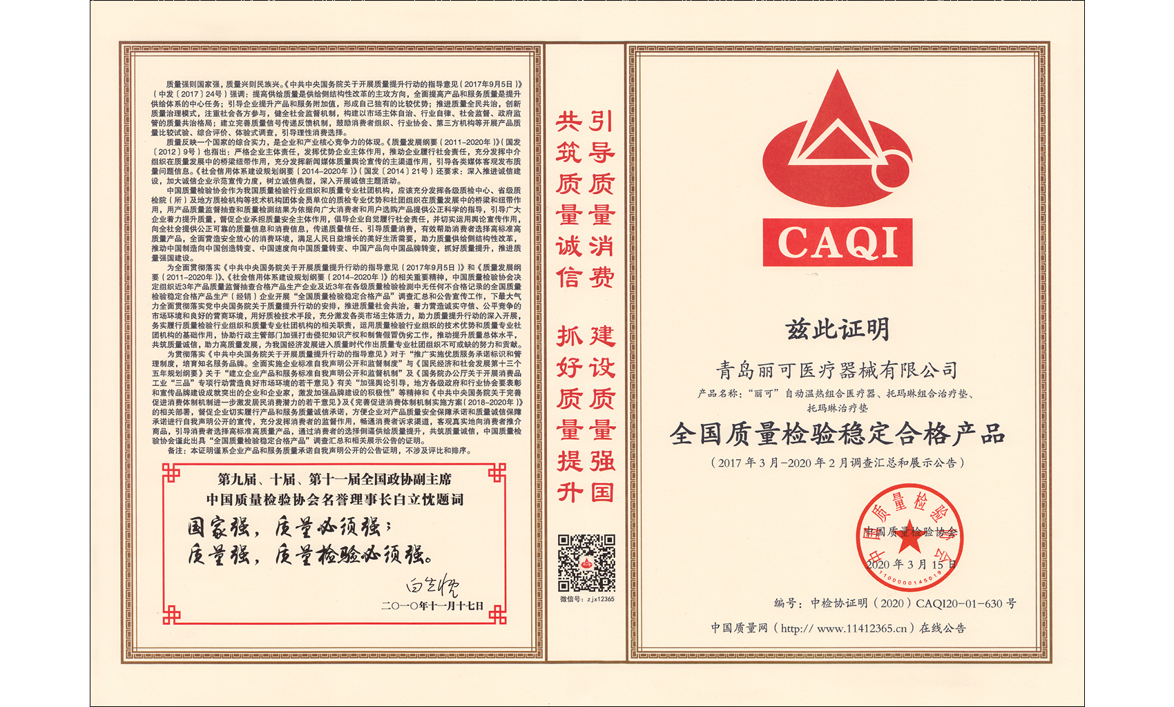 2020年3月15日,國際消費(fèi)者權(quán)益日當(dāng)天,青島麗可醫(yī)療器械有限公司獲得了中國質(zhì)量檢驗(yàn)協(xié)會(huì)頒發(fā)的榮譽(yù):"全國產(chǎn)品和服務(wù)質(zhì)量誠信示范企業(yè)"。