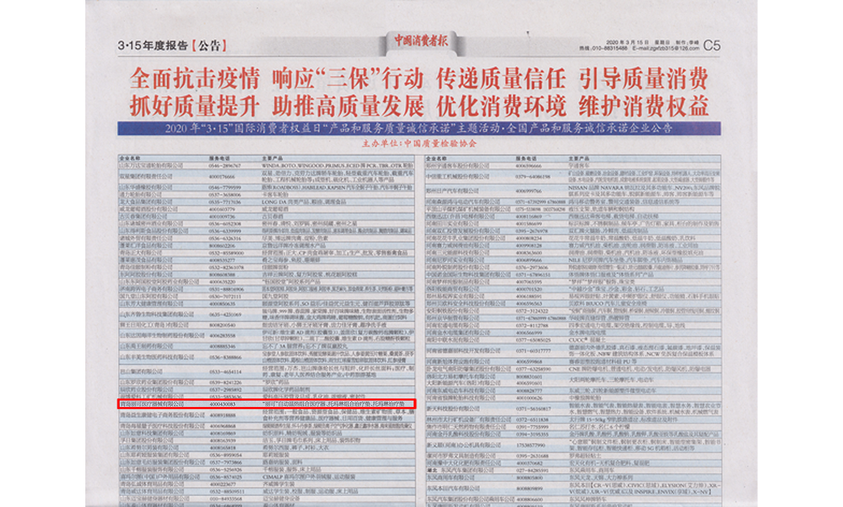 中國質(zhì)量報(bào)、中國消費(fèi)者報(bào)公布了獲獎(jiǎng)企業(yè)名錄。