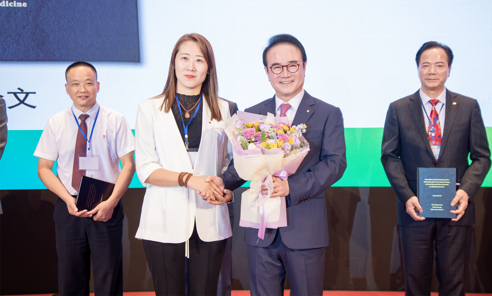 為了祝賀曹勝鉉會(huì)長(zhǎng)獲得理學(xué)博士學(xué)位,在發(fā)表致辭前,天津支社的崔麗花支社長(zhǎng)代表全體事業(yè)者為會(huì)長(zhǎng)獻(xiàn)上了鮮花。會(huì)長(zhǎng)也將博士論文贈(zèng)送給各位總代理以表紀(jì)念。在博士論文中,曹勝鉉會(huì)長(zhǎng)以麗可產(chǎn)品為研究對(duì)象,通過多項(xiàng)臨床試驗(yàn)充分證明了產(chǎn)品的優(yōu)越性。相信該論文的發(fā)布也將大大提升麗可品牌的影響力。